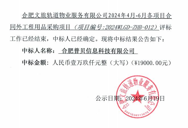 合肥文旅轨道物业服务有限公司2024年4月-6月各项目合同外工程用品采购项目中标结果公告