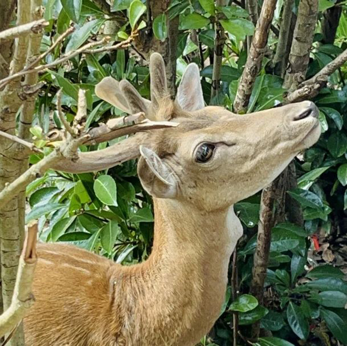 黇鹿也跑来游人面前展示着今年新长的鹿角