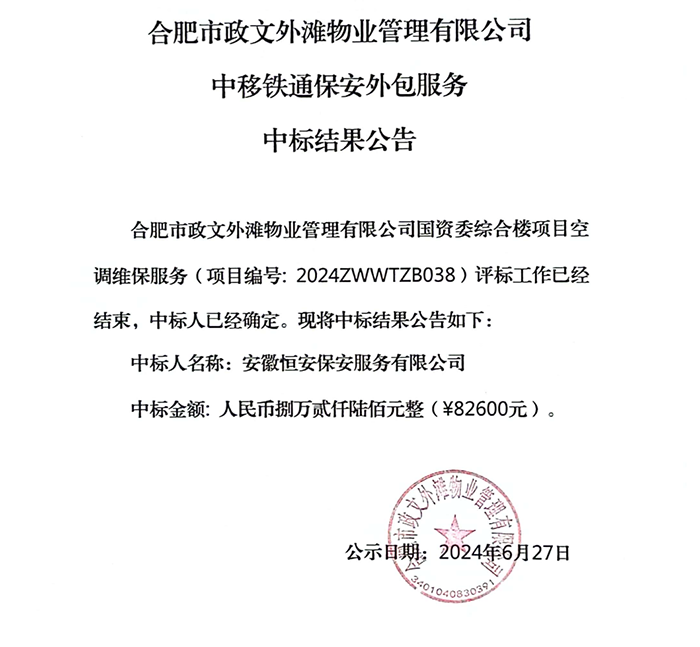 合肥市政文外滩物业管理有限公司中移铁通保安外包服务中标结果公告
