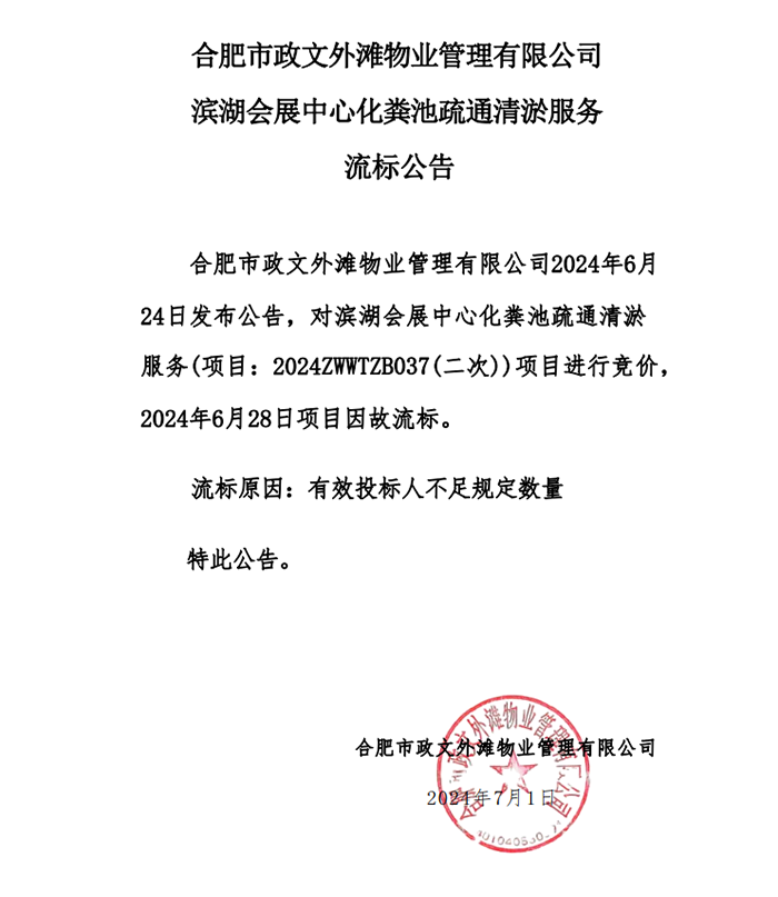 合肥市政文外滩物业管理有限公司滨湖会展中心化粪池疏通清淤服务流标公告
