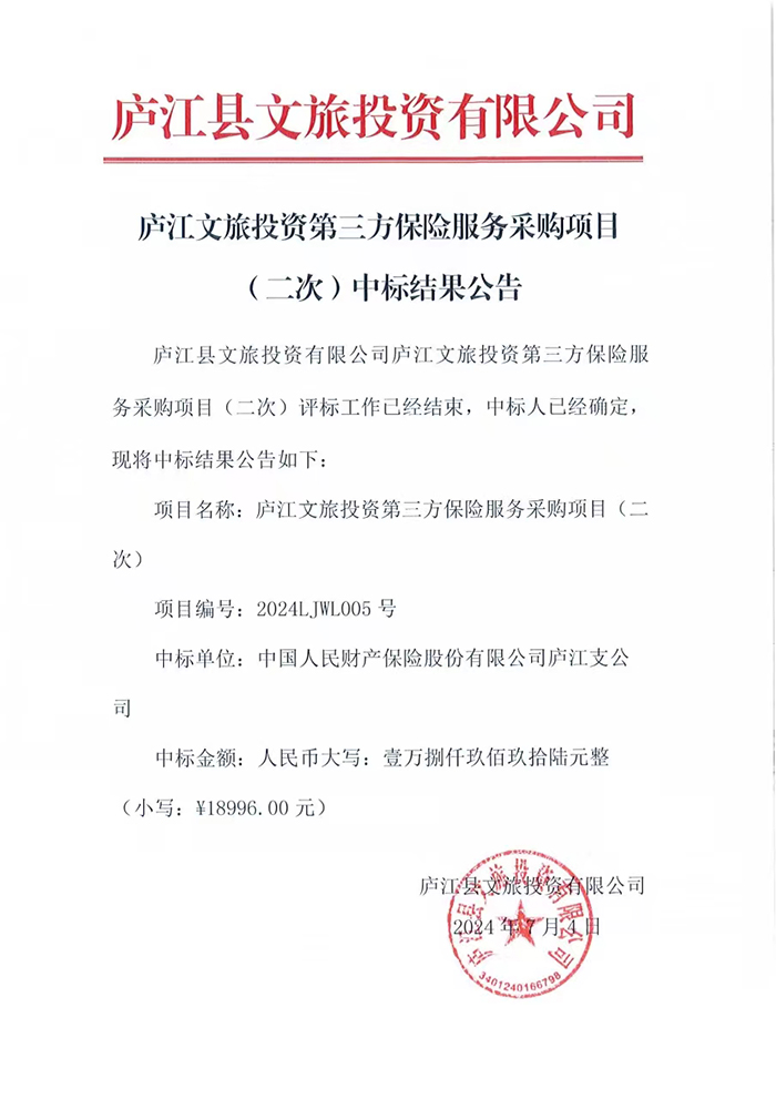 庐江文旅投资第三方保险服务采购项目(二次)中标结果公告