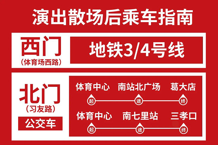 为保障观众朋友们快速有序、安全退场,本场演出结束后会在合肥体育中心西门/北门共安排60辆公交车用于疏散服务。