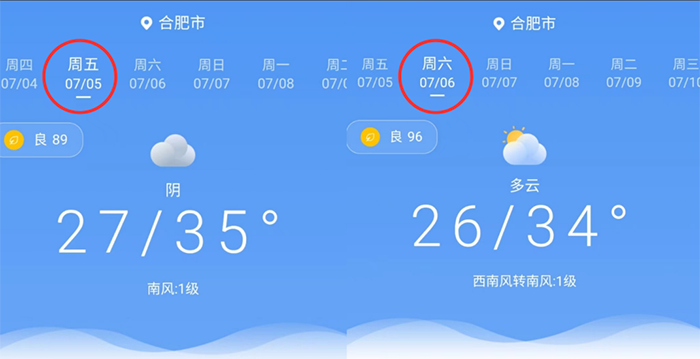 根据气象台发布的天气预报显示,7月5日为阴,7月6日为阴转多云,最高气温35摄氏度,您可按个人习惯增减衣物,请注意防暑。