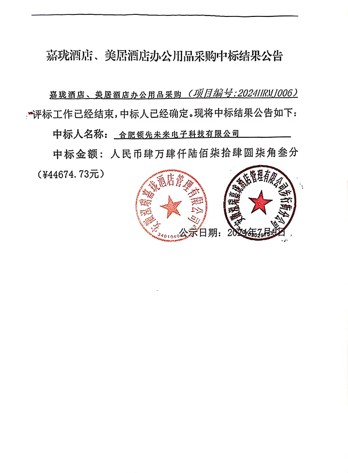 嘉珑酒店、美居酒店办公用品采购中标结果公告