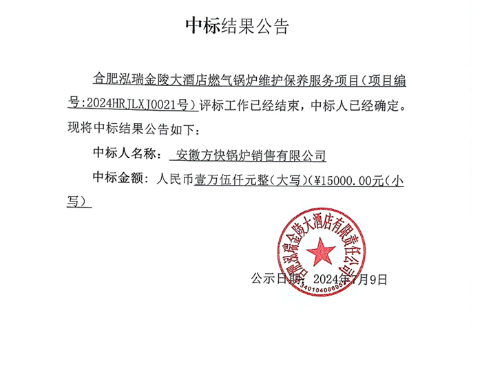 合肥泓瑞金陵大酒店燃气锅炉维护保养服务项目