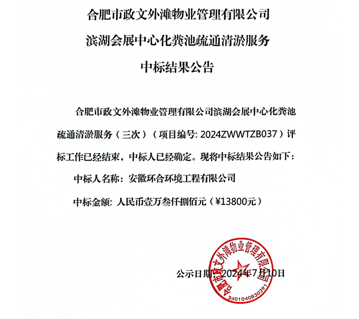 合肥市政文外滩物业管理有限公司滨湖会展中心化粪池疏通清淤服务中标结果公告