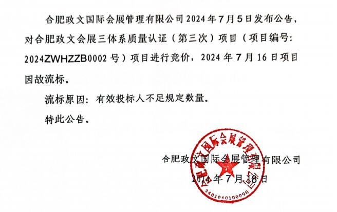 合肥政文会展三体系质量认证(第三次)项目流标公告