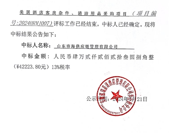 美居酒店客房杂件、清洁用品采购中标结果公告