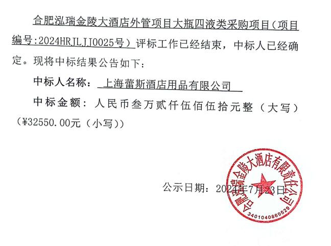 合肥泓瑞金陵大酒店有限责任公司外管项目大瓶四液类采购项目中标结果公告