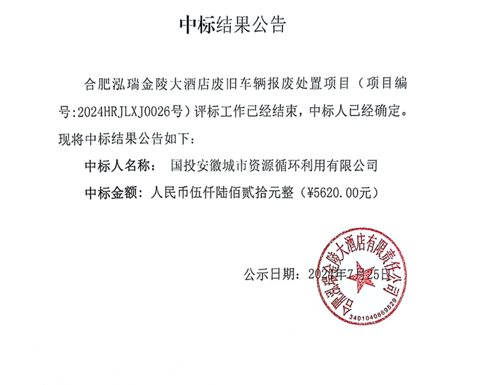 合肥泓瑞金陵大酒店废旧车辆报废处置项目