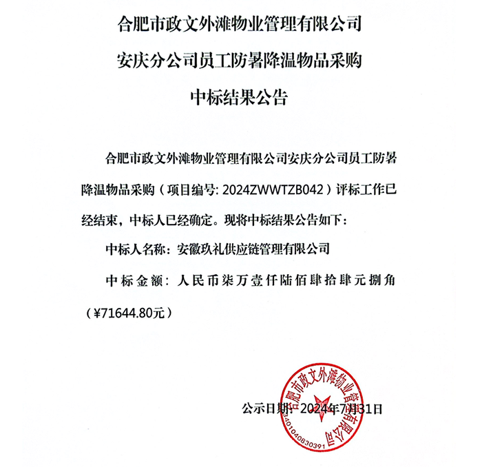 合肥市政文外滩物业管理有限公司安庆分公司员工防暑降温物品采购中标结果公告