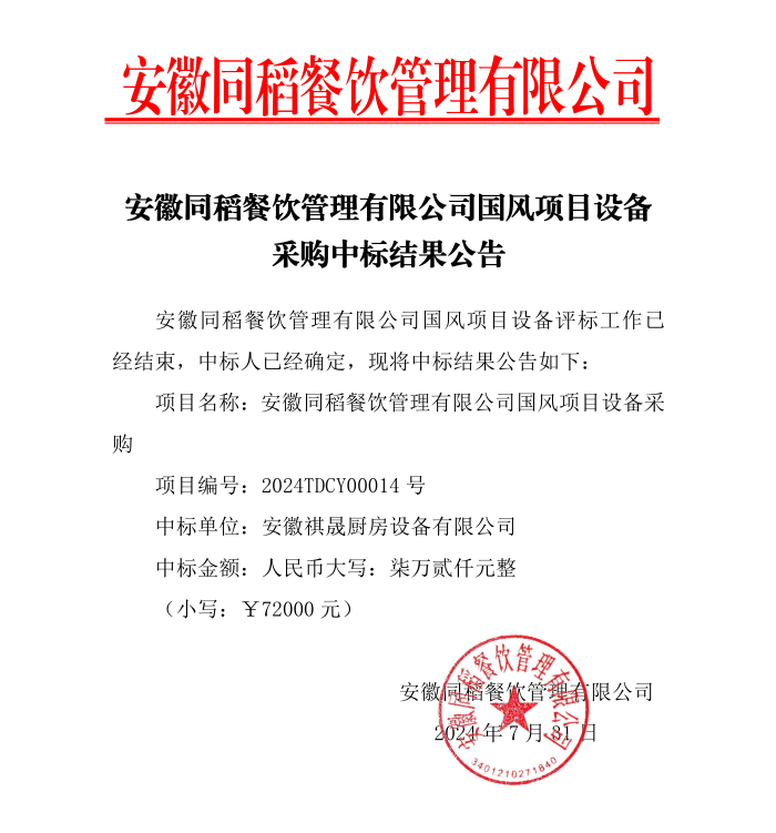 安徽同稻餐饮管理有限公司国风项目设备采购中标结果公告