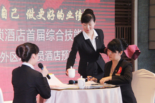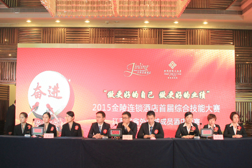 7月12日,来自江苏省省外区域6家成员酒店的35名选手齐聚合肥泓瑞金陵大酒店,参加“做更好的自己 做更好的业绩”2015金陵连锁酒店首届综合技能大赛江苏省省外区域成员酒店预赛,进行GRO接待服务、会议顾问服务、厨房技艺及知识竞赛等4个比赛项 目的角逐。