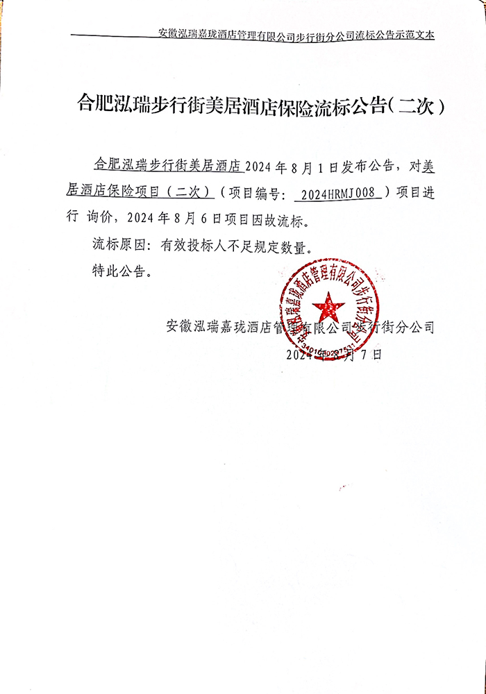 合肥泓瑞步行街美居酒店保险流标公告(二次)