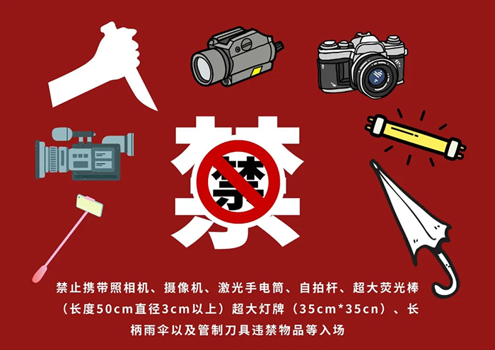8、不限于未经授权的专业相机,可能干扰或影响活动顺利进行的物品,包括但不限于相机(演唱会观演可携带相机机型包括:微单、拍立得、CCD、卡片相机、胶片相机机身尺寸不得超过140x100x80mm、重量不得超过500克;及尺寸不超过75mm、重量不超过300克、焦段低于200mm的镜头)、无人机、三脚架自拍杆、激光装置、扩音设备、无线电干扰等设备;