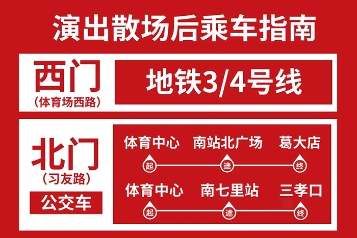 为保障观众朋友们快速有序、安全退场,本场演出结束后将安排70辆公交车用于赛场疏散保障,观众散场后可根据现场指示选择相应公交路线。