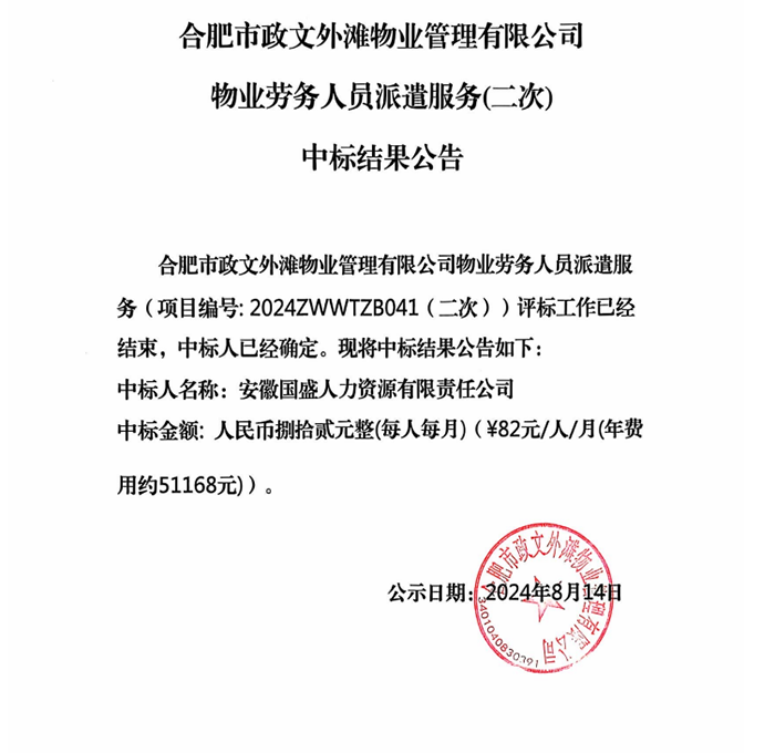 合肥市政文外滩物业管理有限公司物业劳务人员派遣服务(二次)中标结果公告