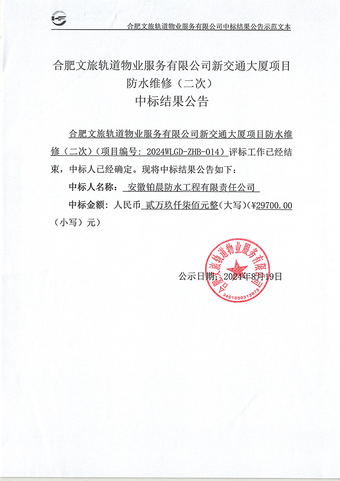 合肥文旅轨道物业服务有限公司新交通大厦项目防水维修(二次) 中标结果公告