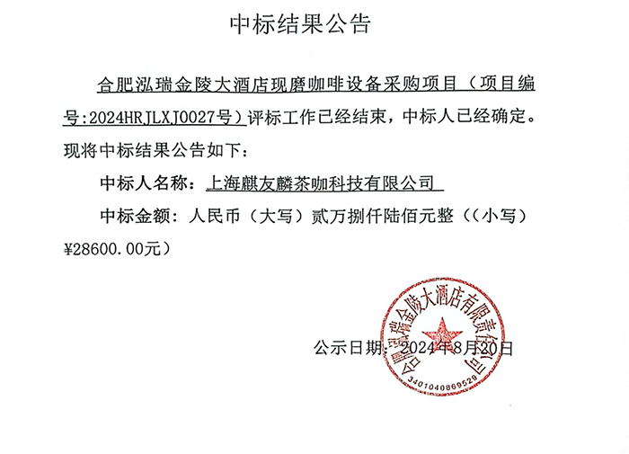 合肥泓瑞金陵大酒店现磨咖啡设备采购项目