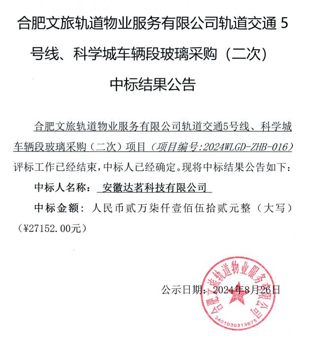 合肥文旅轨道物业服务有限公司轨道交通5号线、科学城车辆段玻璃采购(二次) 中标结果公告