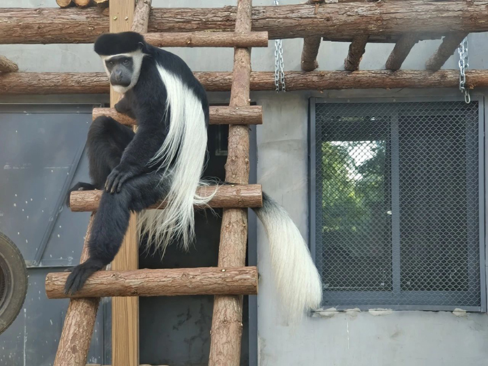 野外生存的东非黑白疣猴生活在森林的上层和中层,很少到地面活动,这也是为什么我们工作人员要在笼舍中搭建这么多爬架的原因,这就是它们的习性,在高处会让它们有安全感。当您前来参观时,可以抬头将目光上移,就会看到它们的身影。 拍打玻璃和随意投喂都是不文明的行为哦!