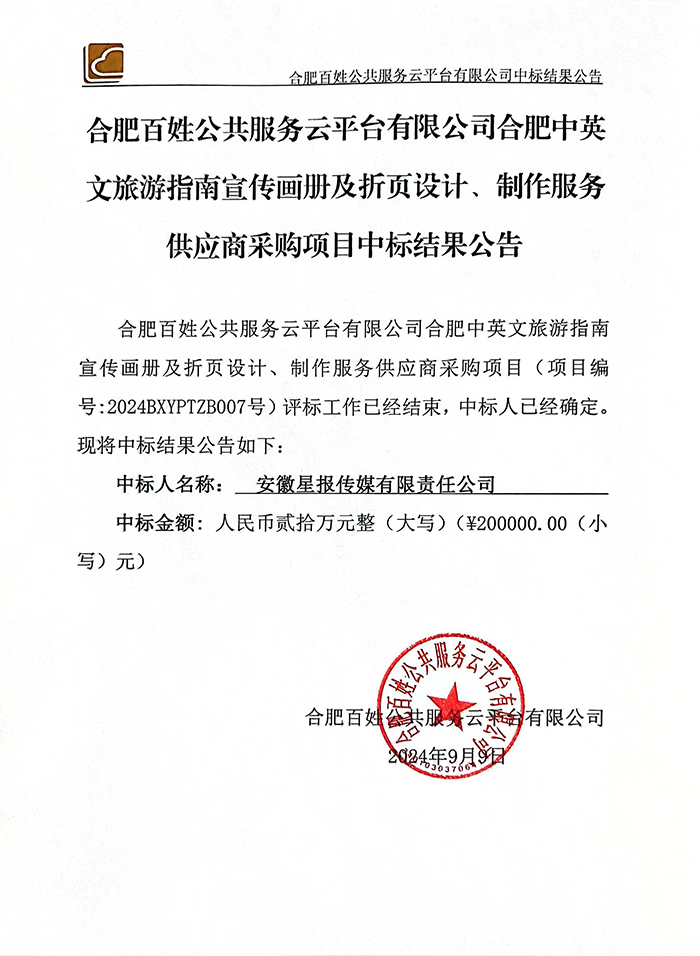 合肥百姓公共服务云平台有限公司合肥中英文旅游指南宣传画册及折页设计、制作服务供应商采购项目中标结果公告