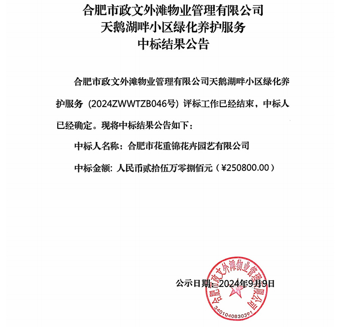 合肥市政文外滩物业管理有限公司天鹅湖畔小区绿化养护服务中标结果公告