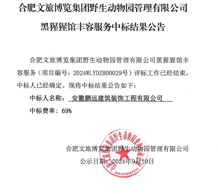 合肥文旅博览集团野生动物园管理有限公司黑猩猩馆丰容服务中标结果公告