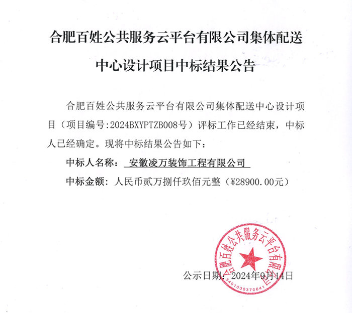 合肥百姓公共服务云平台有限公司集体配送中心设计项目中标结果公告