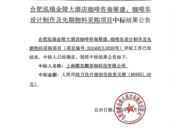 合肥泓瑞金陵大酒店咖啡咨询筹建、咖啡车设计制作及先期物料采购项目中标结果公告