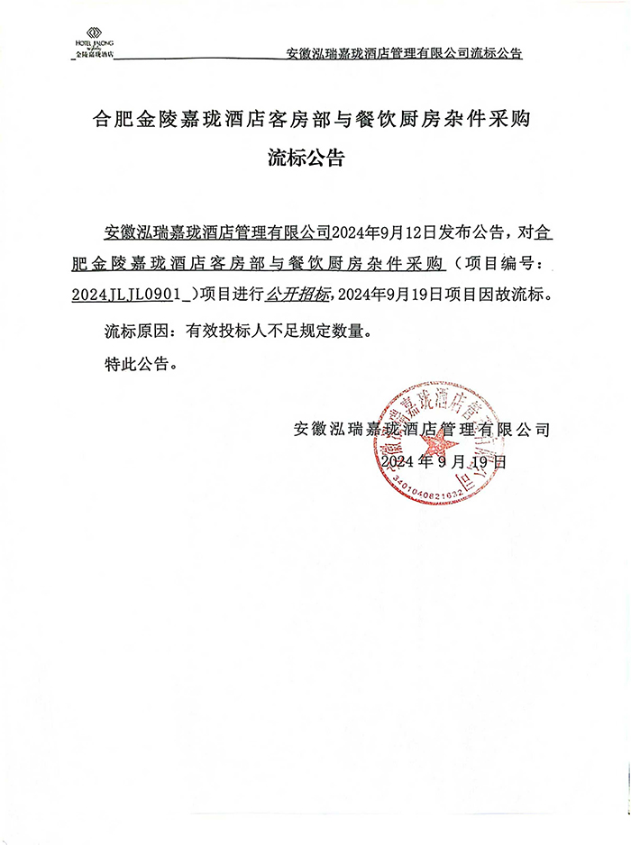 合肥金陵嘉珑酒店客房部与餐饮厨房杂件采购流标公告