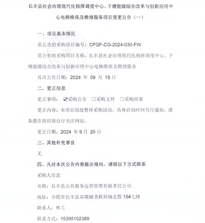 长丰县社会治理现代化指挥调度中心、下塘能源综合改革与创新应用中心电梯维保及维修服务项目变更公告(一)