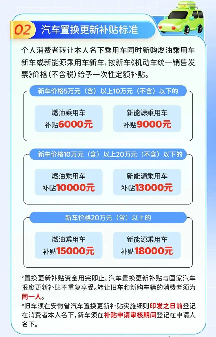 汽车置换更新及汽车报废更新补贴政策分别可以和合肥市各级汽车消费券叠加享受同时,还可享受新能源汽车购置税减免购车金融信贷支持企业配套等组合优惠