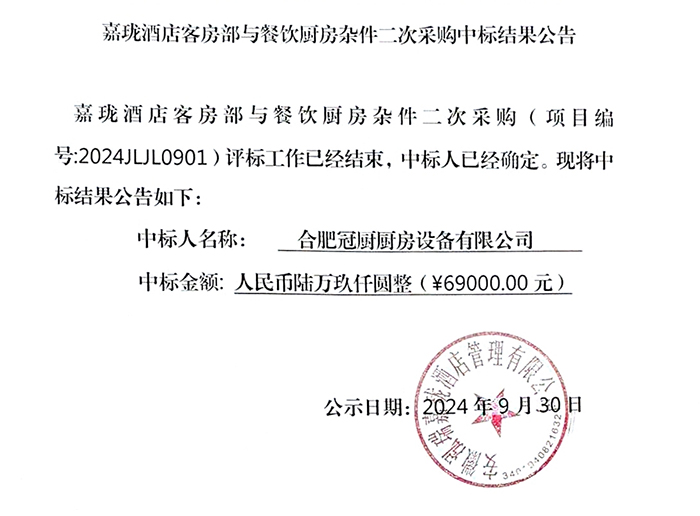嘉珑酒店客房部与餐饮厨房杂件二次采购中标结果公告