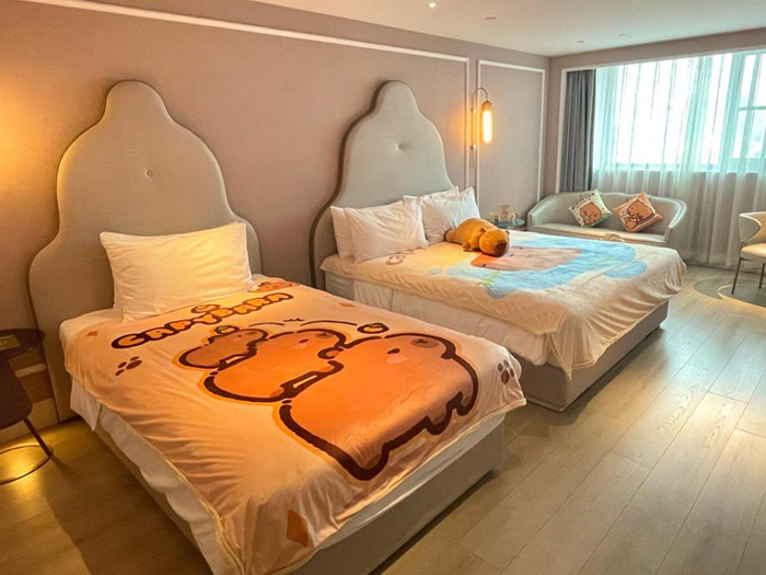 不仅有系列可爱的水豚元素布置 还可以亲手制作卡皮巴拉主题的手工艺品此外只要预定卡皮巴拉主题房办理入住时即可获得两大一小的动物园体验券可以近距离的看到我们水豚小可爱哦