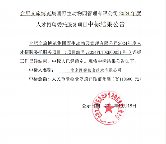合肥文旅博览集团野生动物园管理有限公司2024年度人才招聘委托服务项目中标结果公告