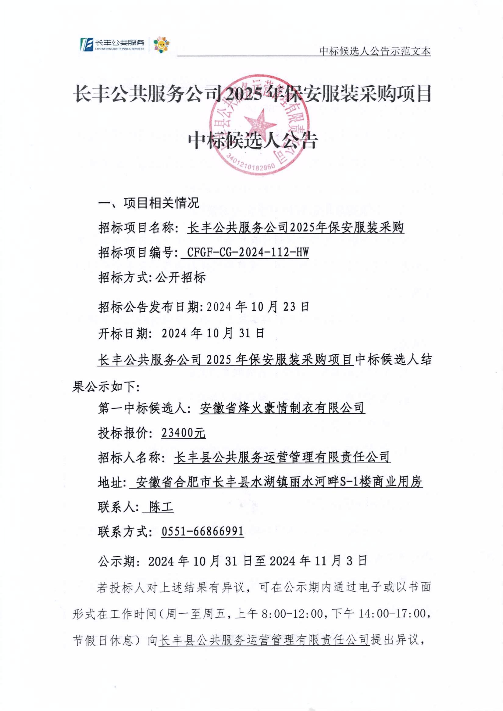长丰公共服务公司2025年保安服装采购项目中标候选人公告
