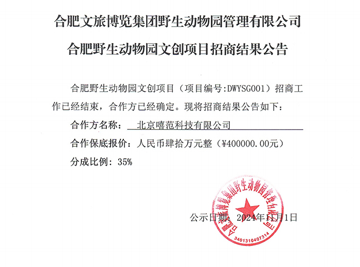 合肥文旅博览集团野生动物园管理有限公司合肥野生动物园文创项目招商结果公告