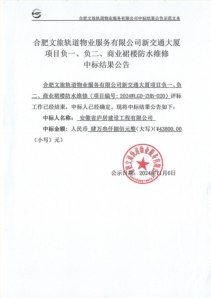 合肥文旅轨道物业服务有限公司新交通大厦项目负一、负二、商业裙楼防水维修中标结果公告