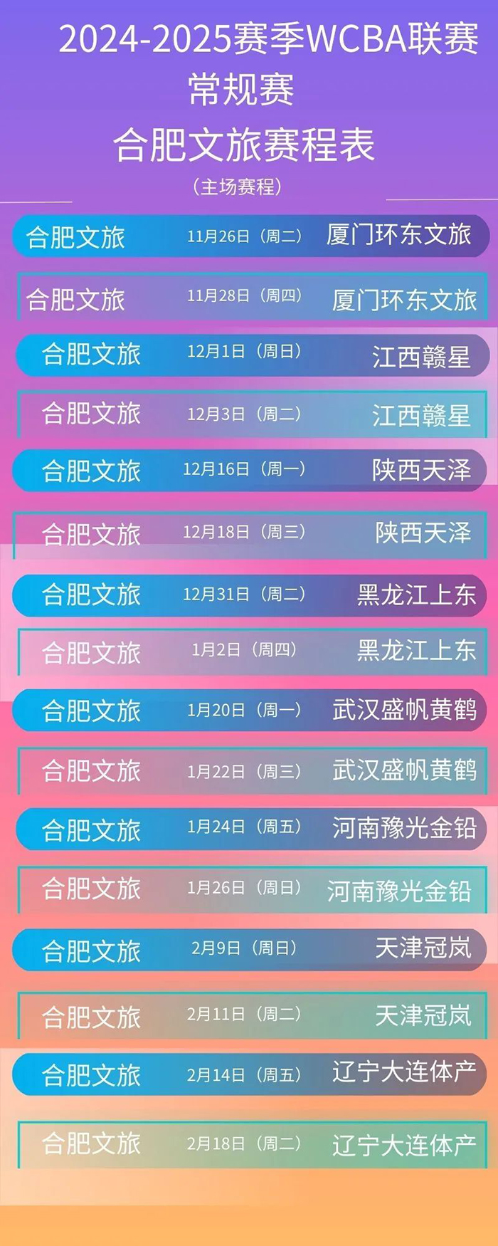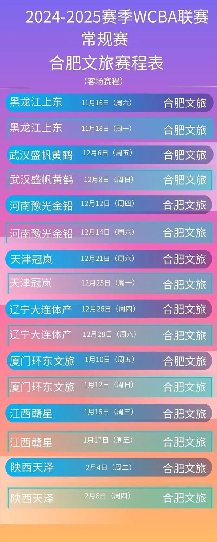 新赛季的首场比赛,合肥文旅将于11月16日赴客场挑战黑龙江上东女篮,而合肥文旅的首个主场比赛定于11月26日坐镇合肥体育中心体育馆迎来厦门环东文旅女篮。