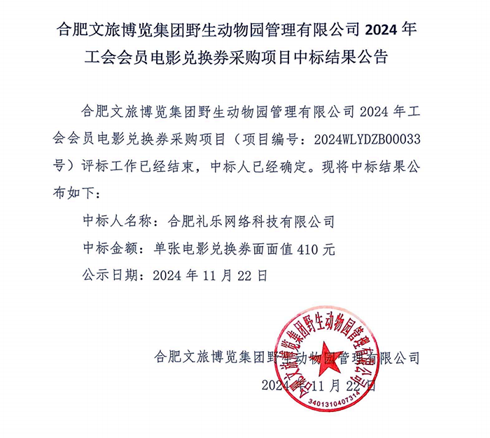 合肥文旅博览集团野生动物园管理有限公司2024年工会会员电影兑换券采购项目中标结果公告