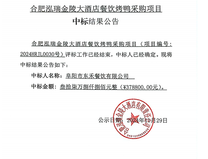 合肥泓瑞金陵大酒店餐饮烤鸭采购项目中标结果公告