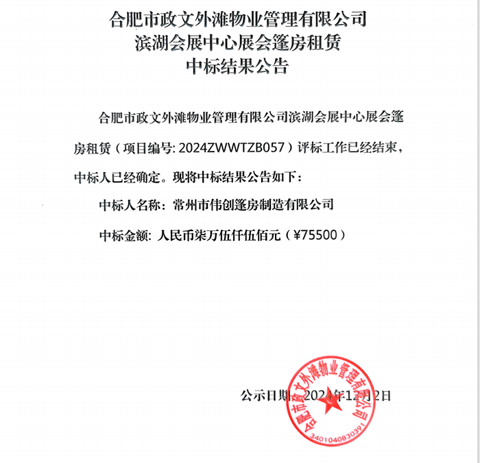 合肥市政文外滩物业管理有限公司滨湖会展中心展会篷房租赁中标结果公告