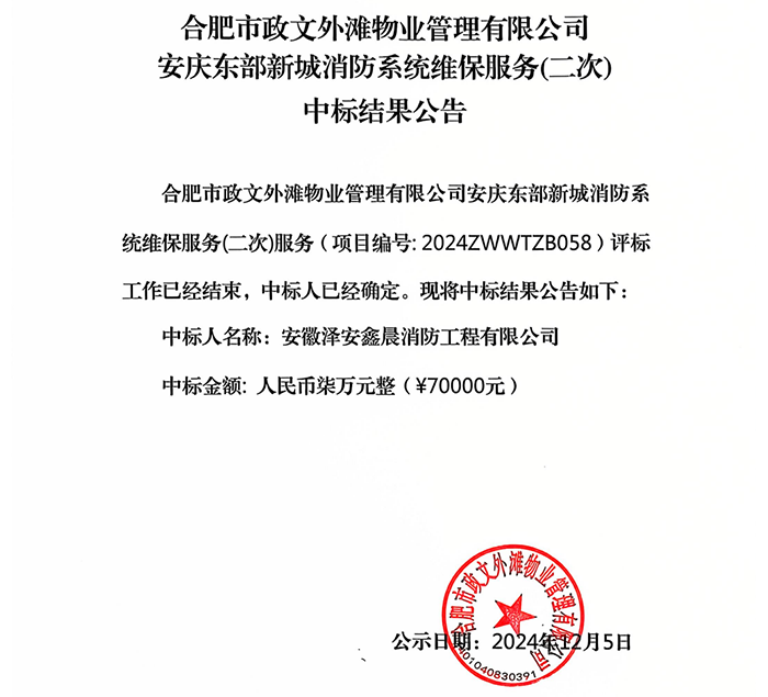 合肥市政文外滩物业管理有限公司安庆东部新城消防系统维保服务(二次)中标结果公告