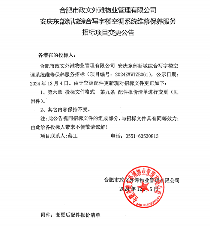合肥市政文外滩物业管理有限公司安庆东部新城综合写字楼空调系统维修保养服务招标项目变更公告