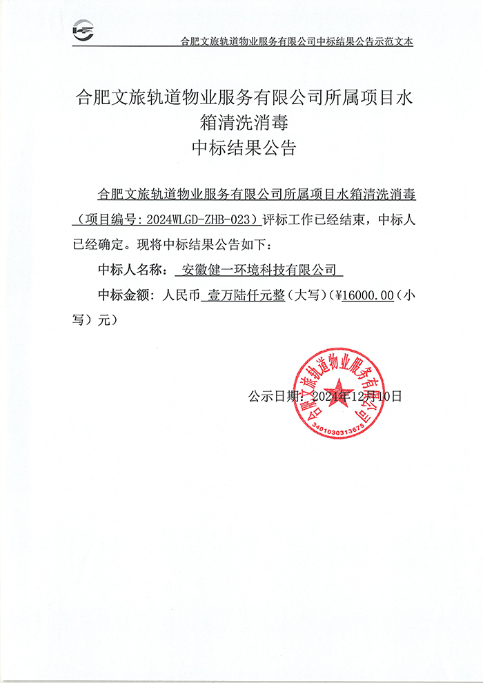 合肥文旅轨道物业服务有限公司所属项目水箱清洗消毒中标结果公告