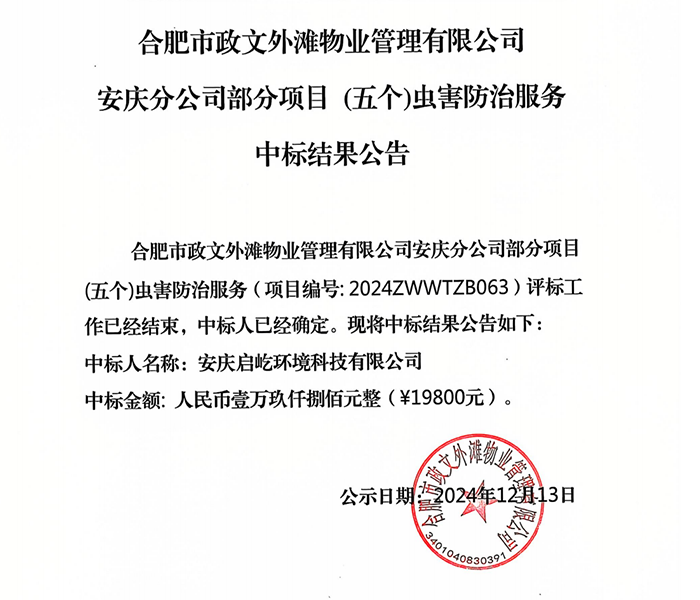 合肥市政文外滩物业管理有限公司安庆分公司部分项目(五个)虫害防治服务中标结果公告