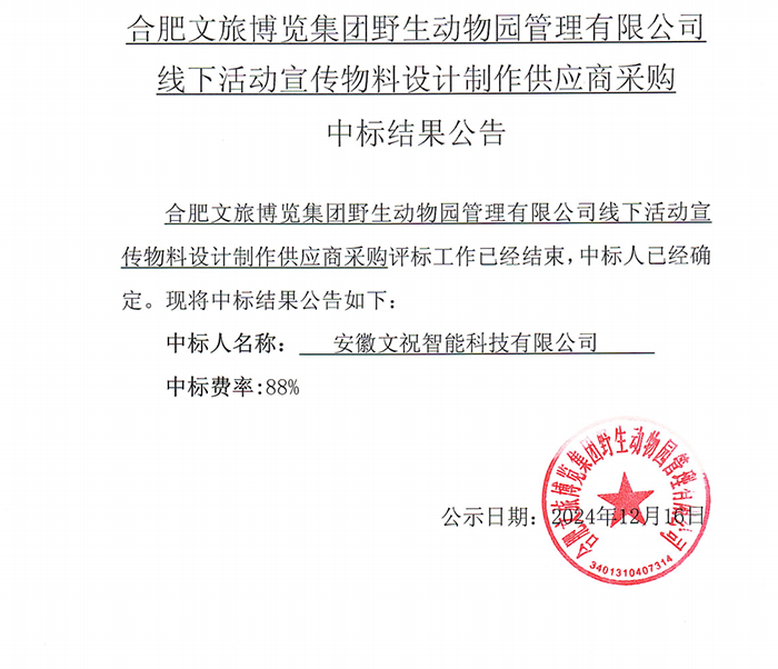 合肥文旅博览集团野生动物园管理有限公司线下活动宣传物料设计制作供应商采购中标结果公告