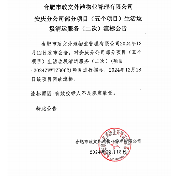合肥市政文外滩物业管理有限公司安庆分公司部分项目(五个项目)生活垃圾清运服务(二次)流标公告