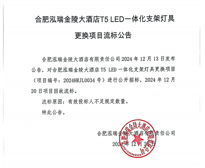 合肥泓瑞金陵大酒店T5 LED一体化支架灯具更换项目流标公告